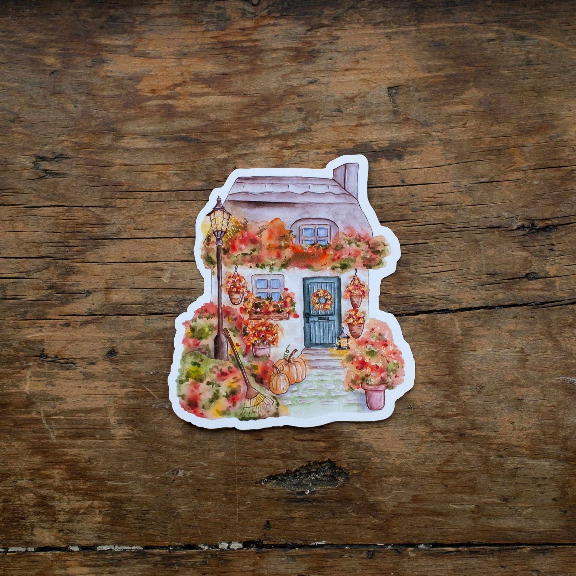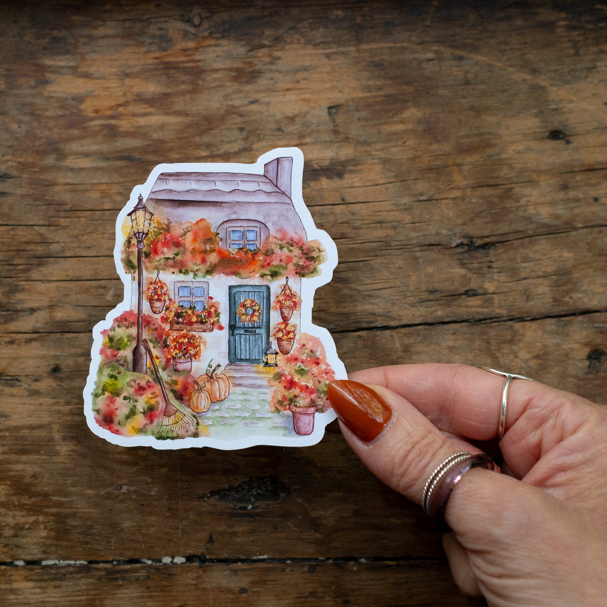 Autocollant de mon cottage d'automne à l'aquarelle, imprimé sur un papier autocollant vinyle mat.