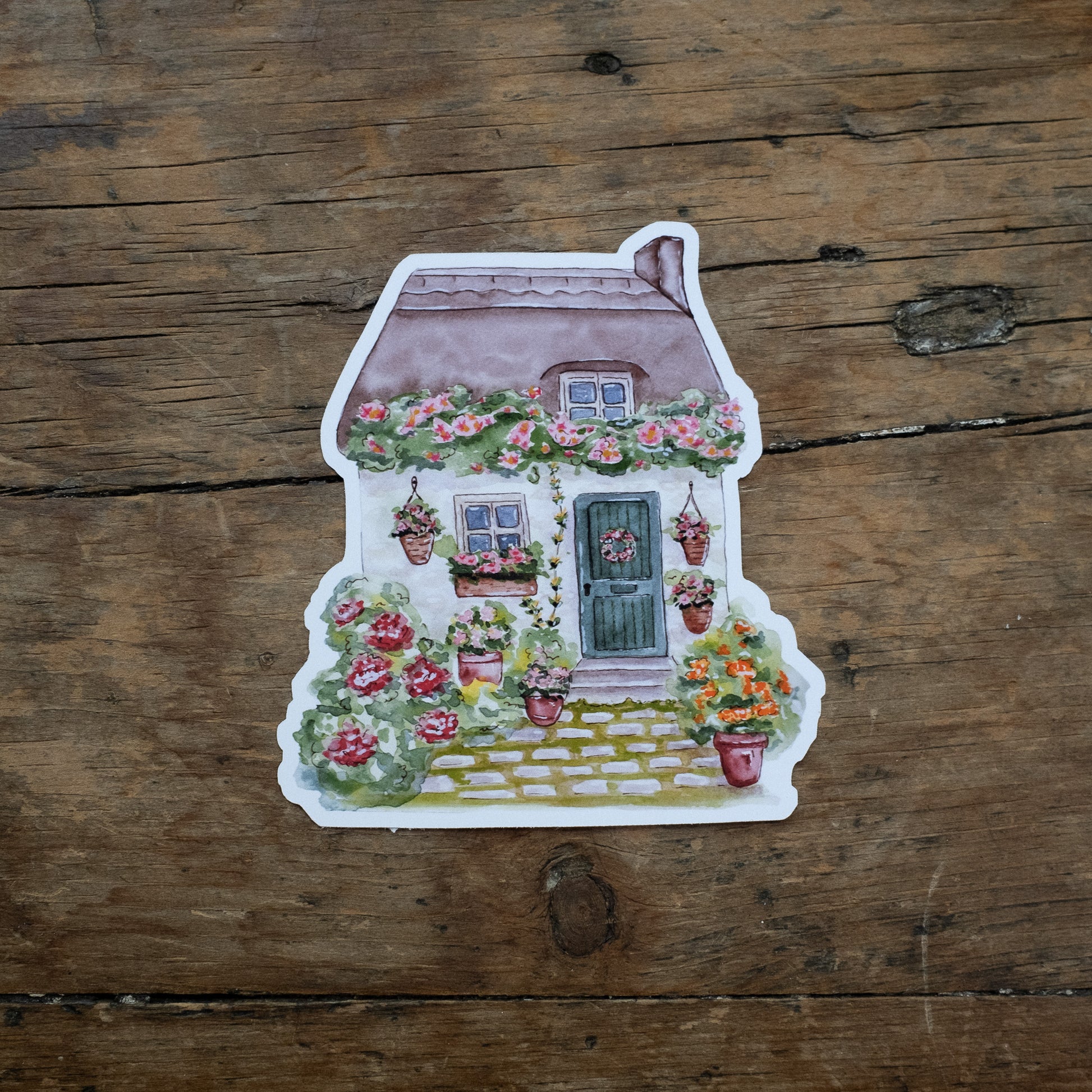 Autocollant de mon cottage fleuri à l'aquarelle, imprimé sur un papier autocollant vinyle mat.