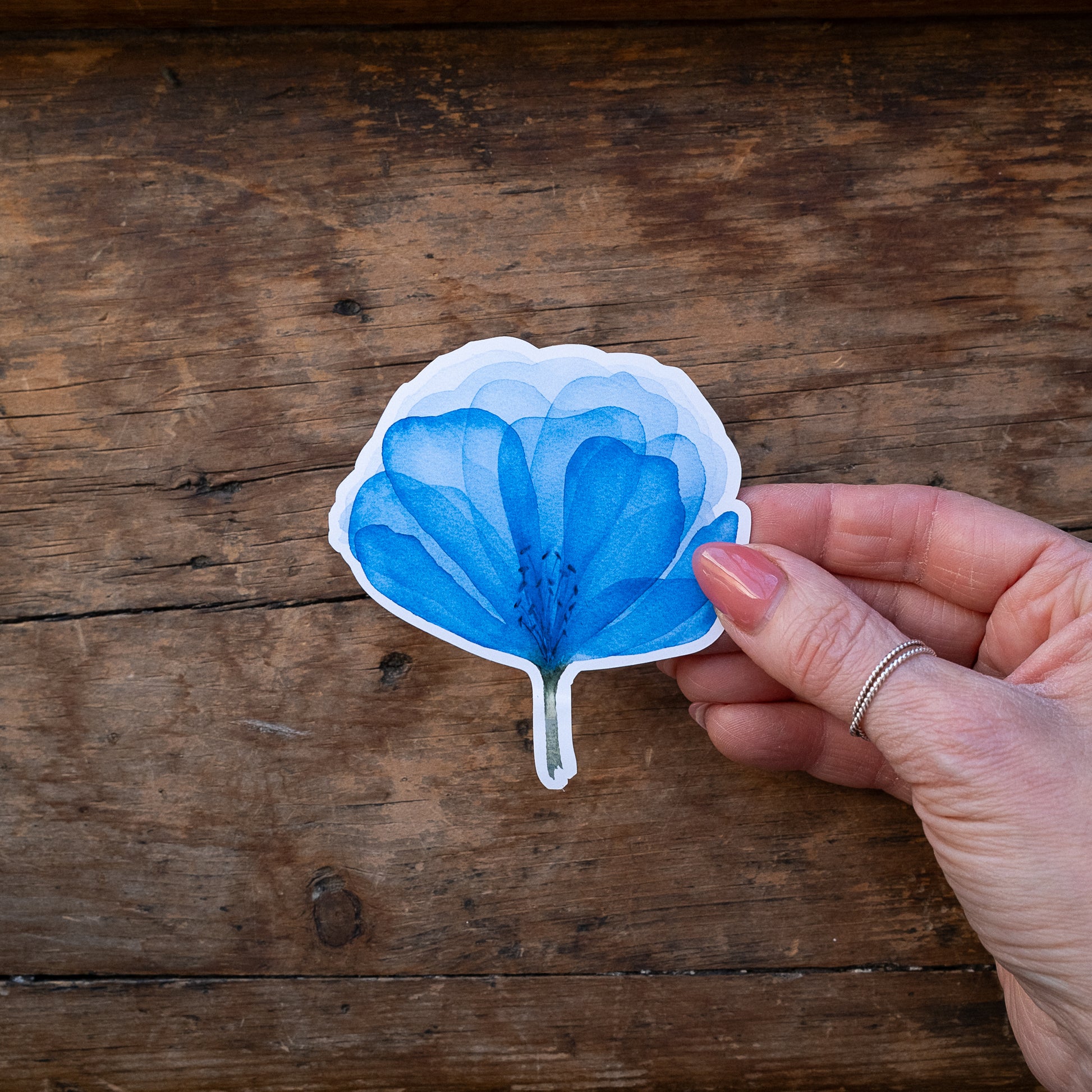 Autocollant de ma fleur bleue diaphane illustrée à l'aquarelle, imprimé sur un papier autocollant vinyle mat.