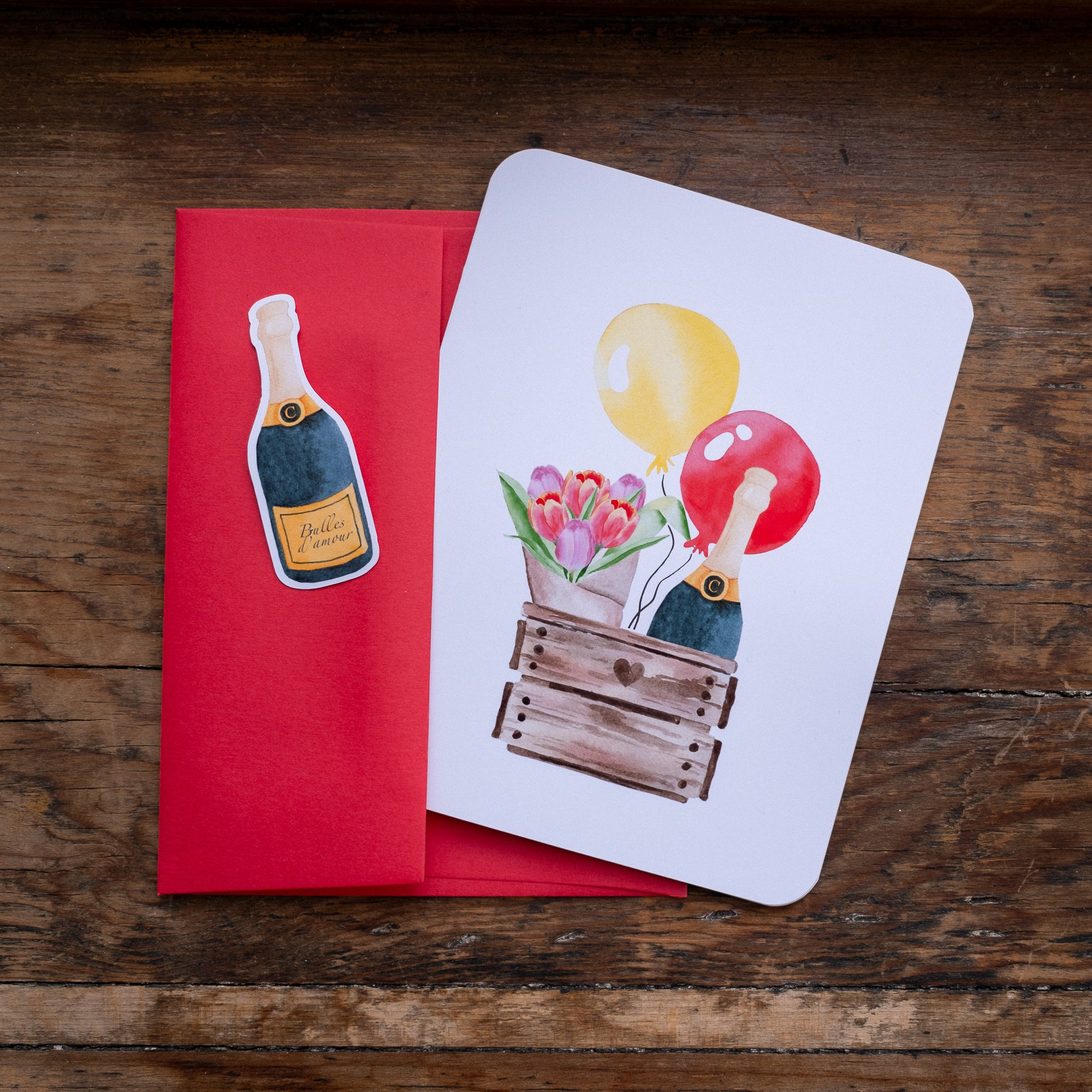 Matériaux utilisés : papier mat cartonné haut de gamme, impression numérique, aquarelle, enveloppe rouge et autocollant vinyl mat.