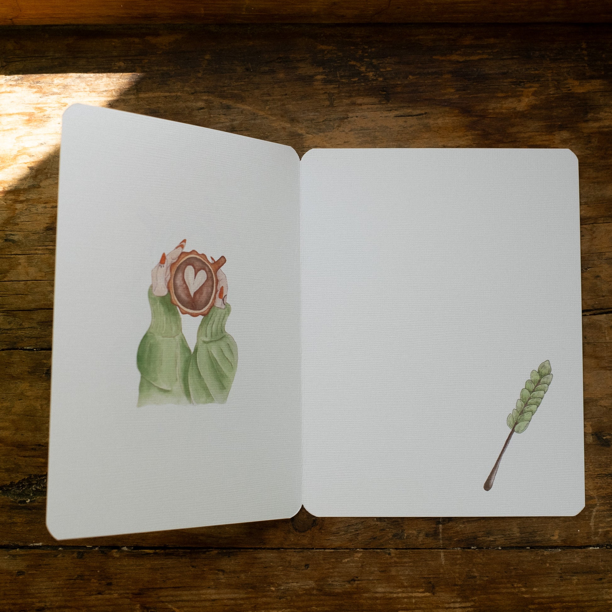 - Carte sans texte, incluant des illustrations miniatures à l’intérieur (voir photo) ainsi qu'un autocollant pour décorer votre enveloppe.