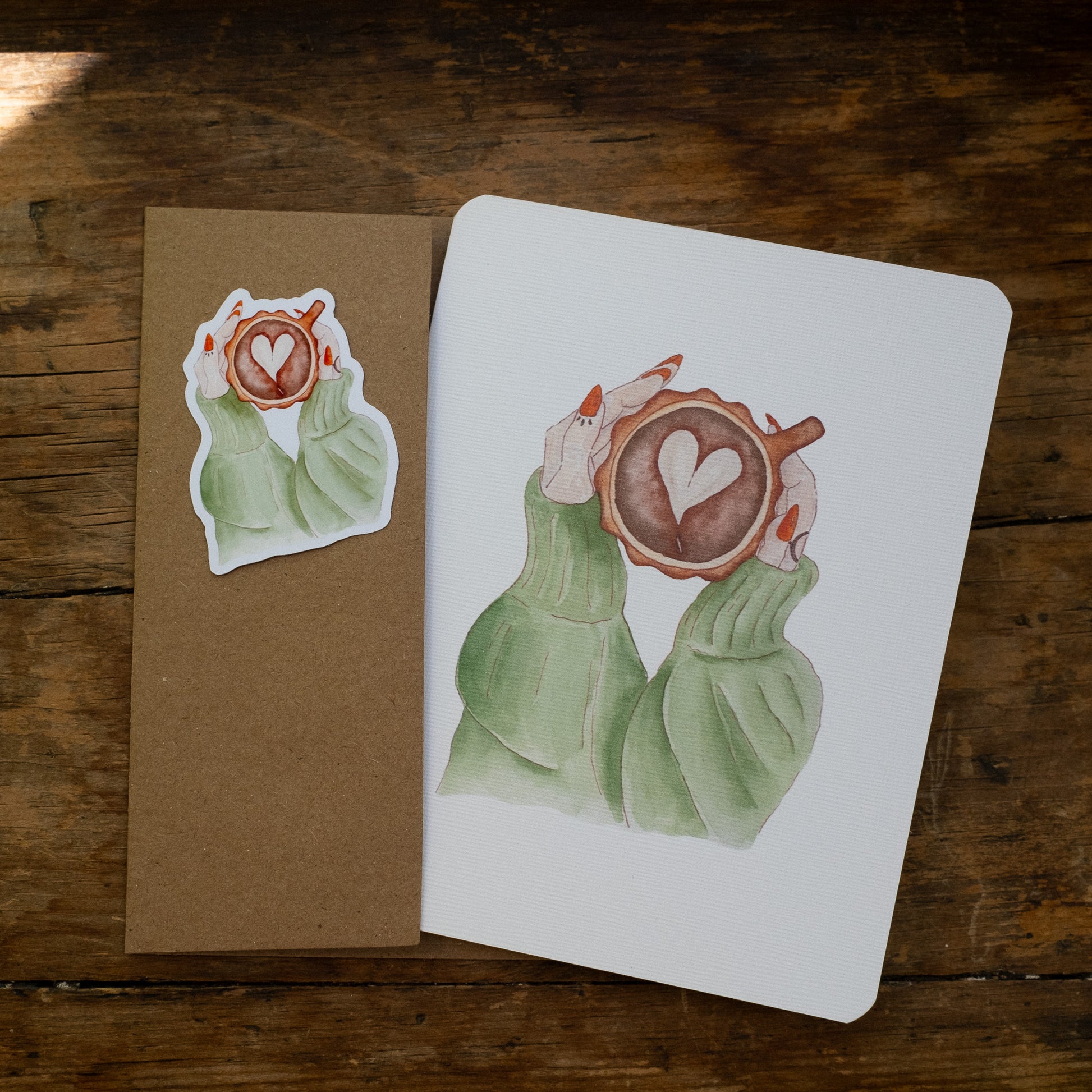 Matériaux utilisés : papier cartonné texturé style lin, haut de gamme, impression numérique, aquarelle, enveloppe Kraft, autocollant vinyle mat.