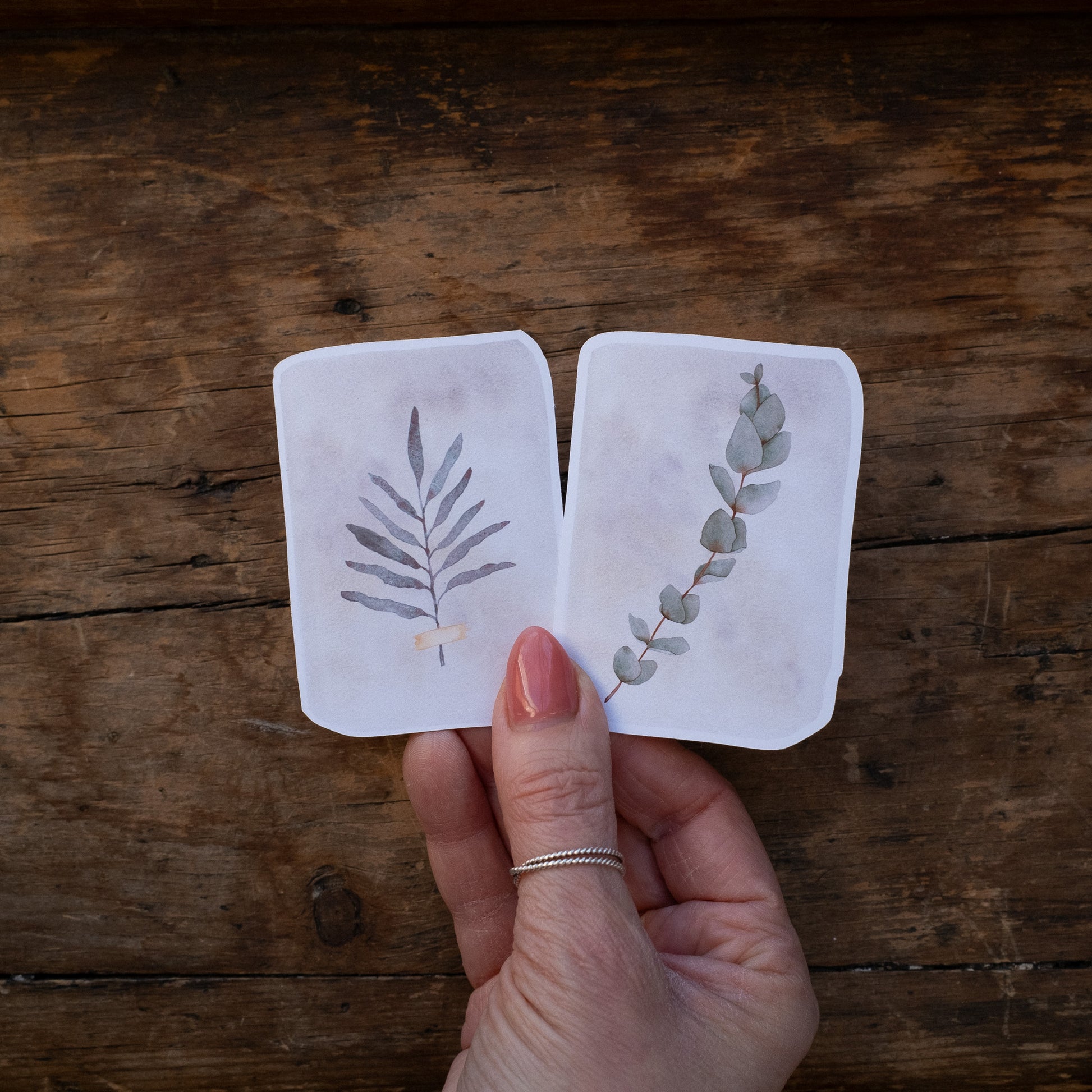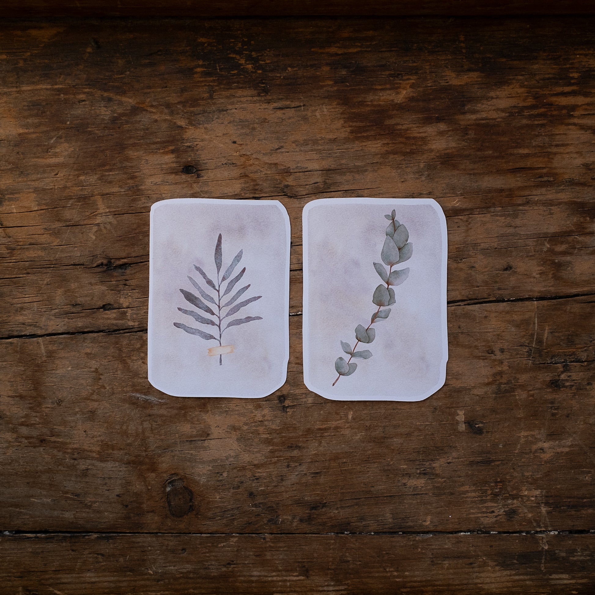 Deux autocollants de mes feuillages préférés illustrés à l'aquarelle, imprimés sur un papier autocollant vinyle mat.