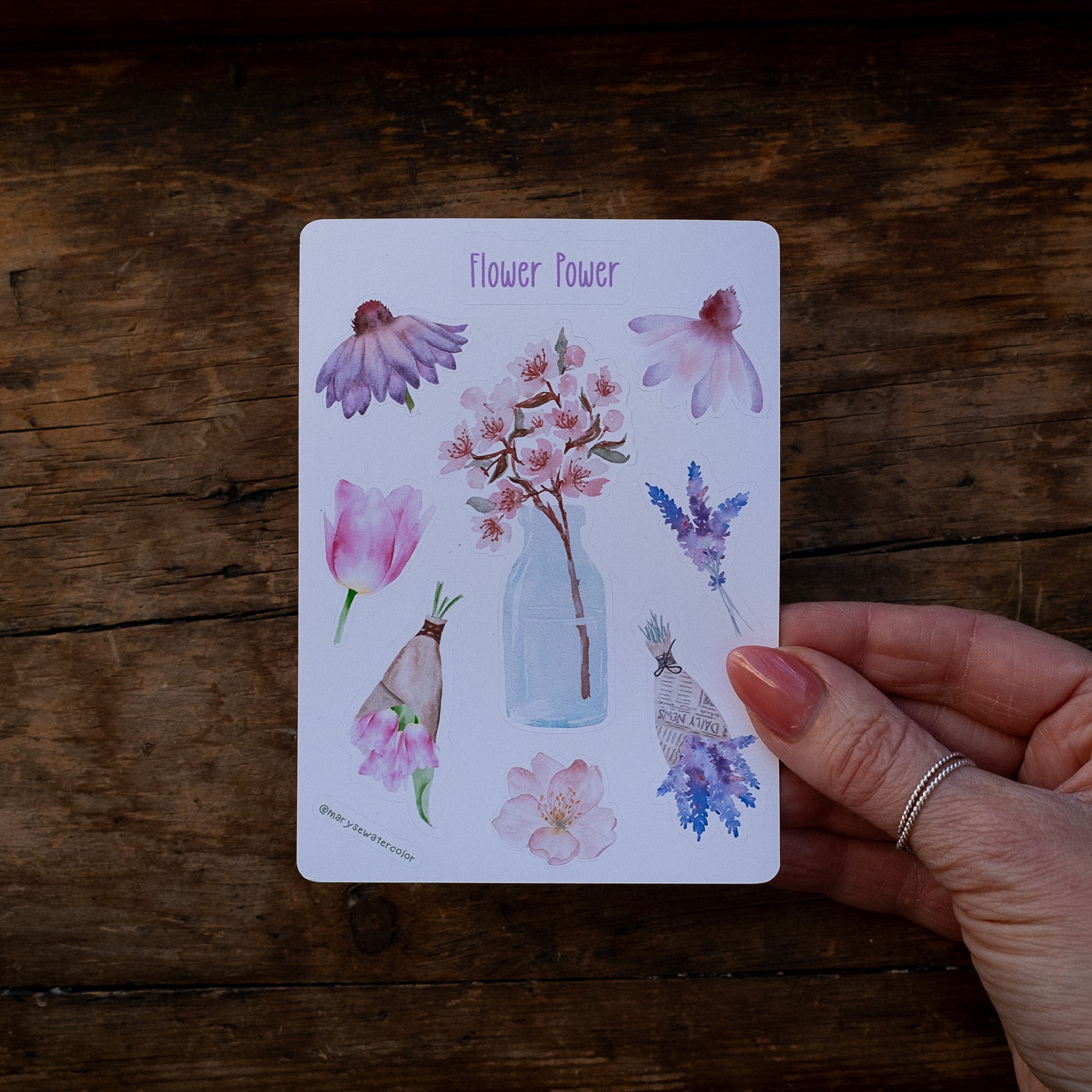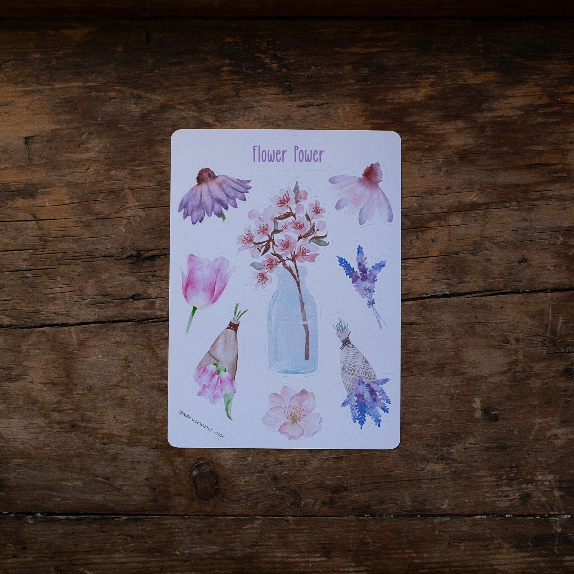 La feuille est composée de 9 autocollants de différentes fleurs illustrées à l'aquarelle et imprimées sur un papier autocollant vinyle mat.