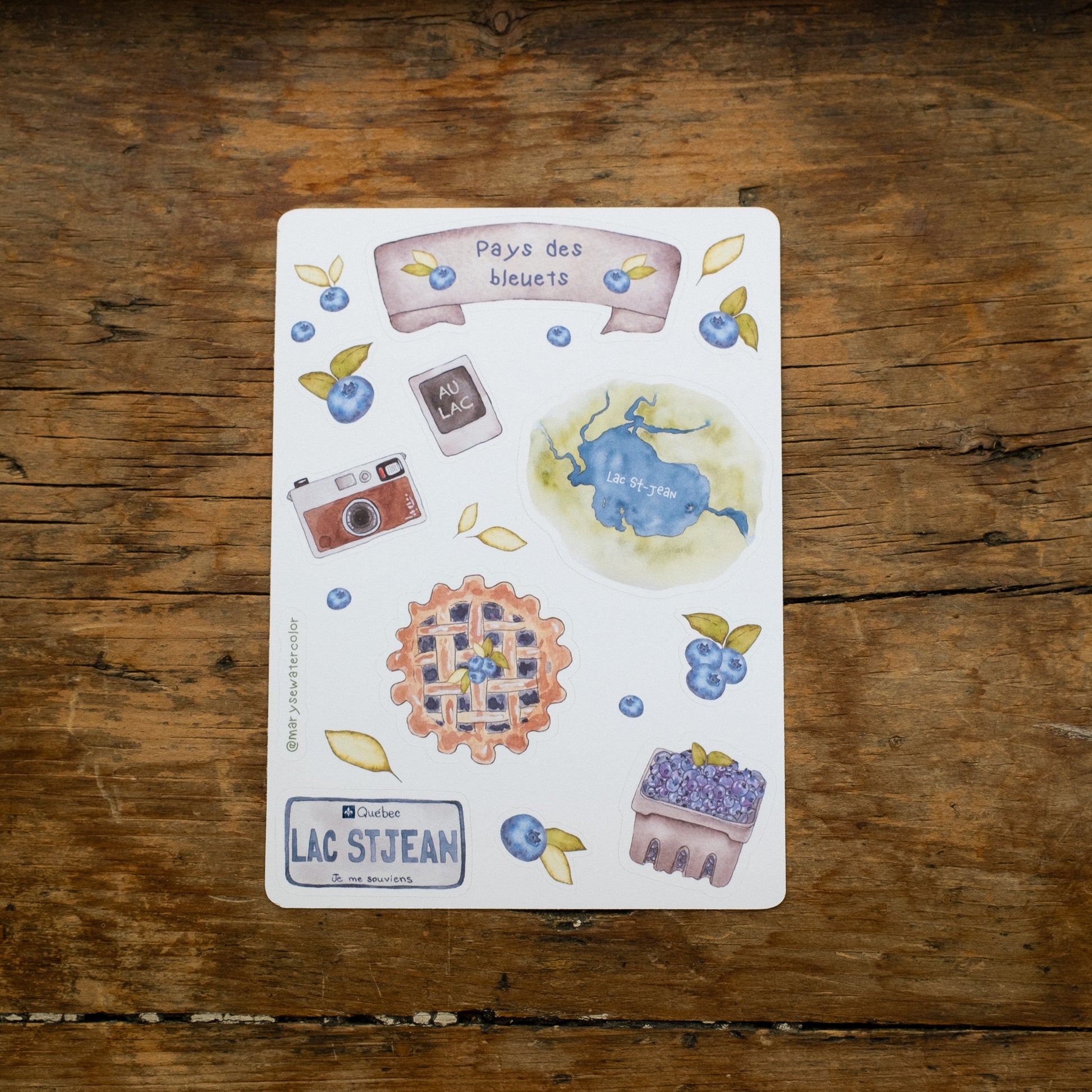 La feuille est composée de 11 autocollants d'icônes représentant ma région natale, illustrés à l'aquarelle et imprimés sur un papier autocollant vinyle mat.