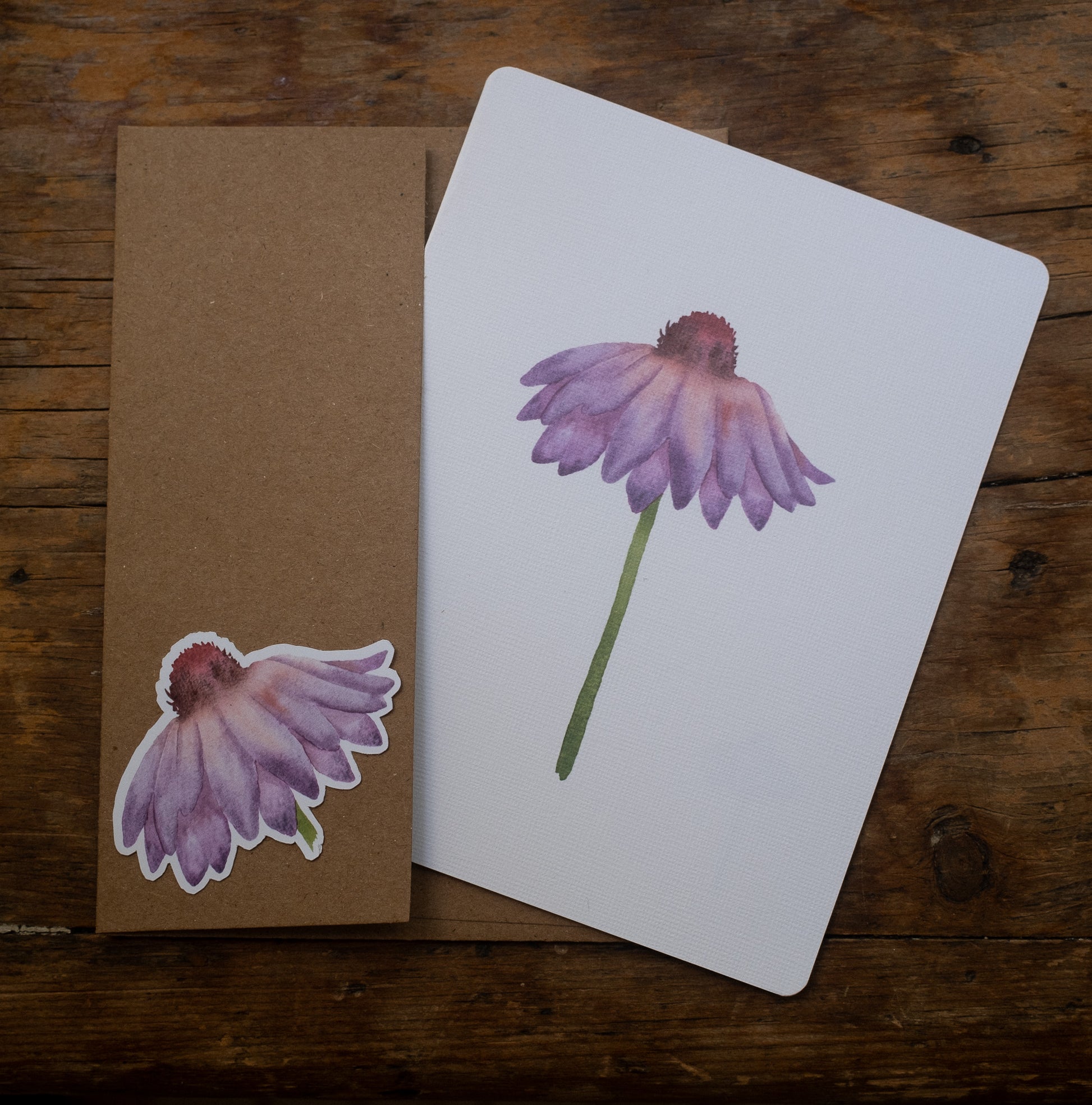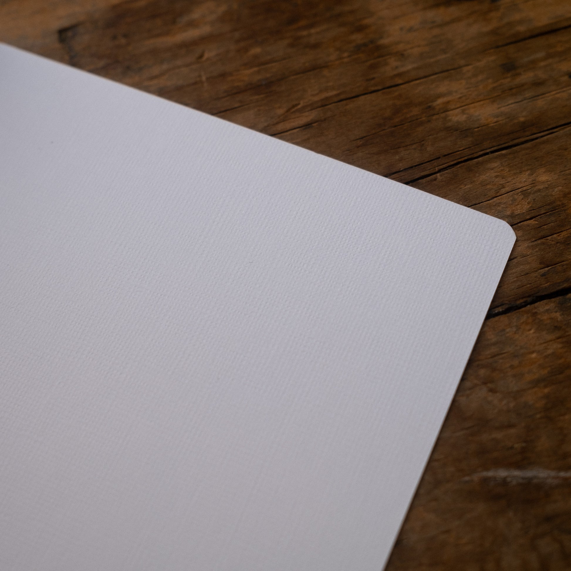 Matériaux utilisés : papier cartonné texturé style lin, haut de gamme, impression numérique, aquarelle, enveloppe Kraft, autocollant vinyl mat.