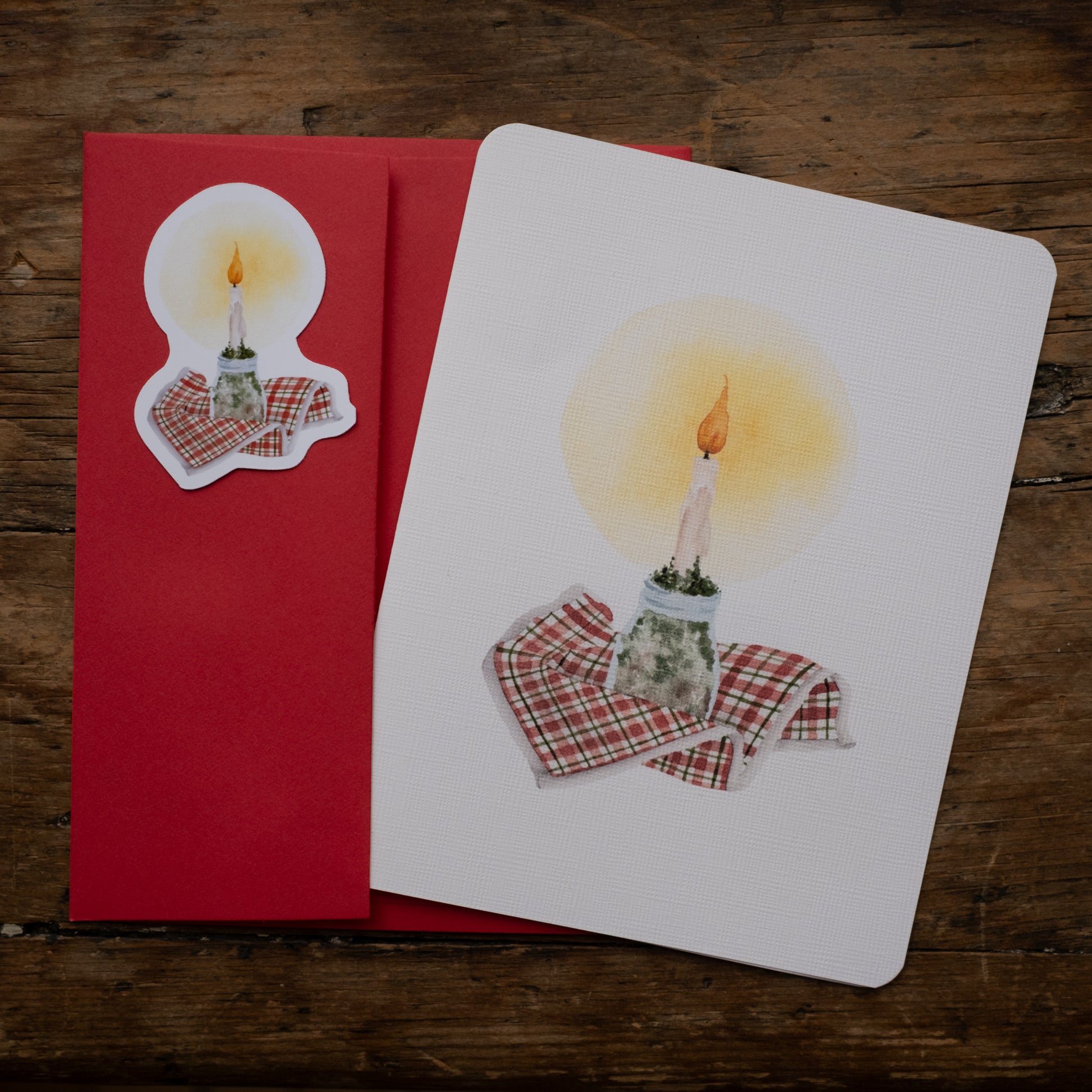 Matériaux utilisés : papier cartonné texturé style lin, haut de gamme, impression numérique, aquarelle, enveloppe rouge, autocollant vinyl mat.
