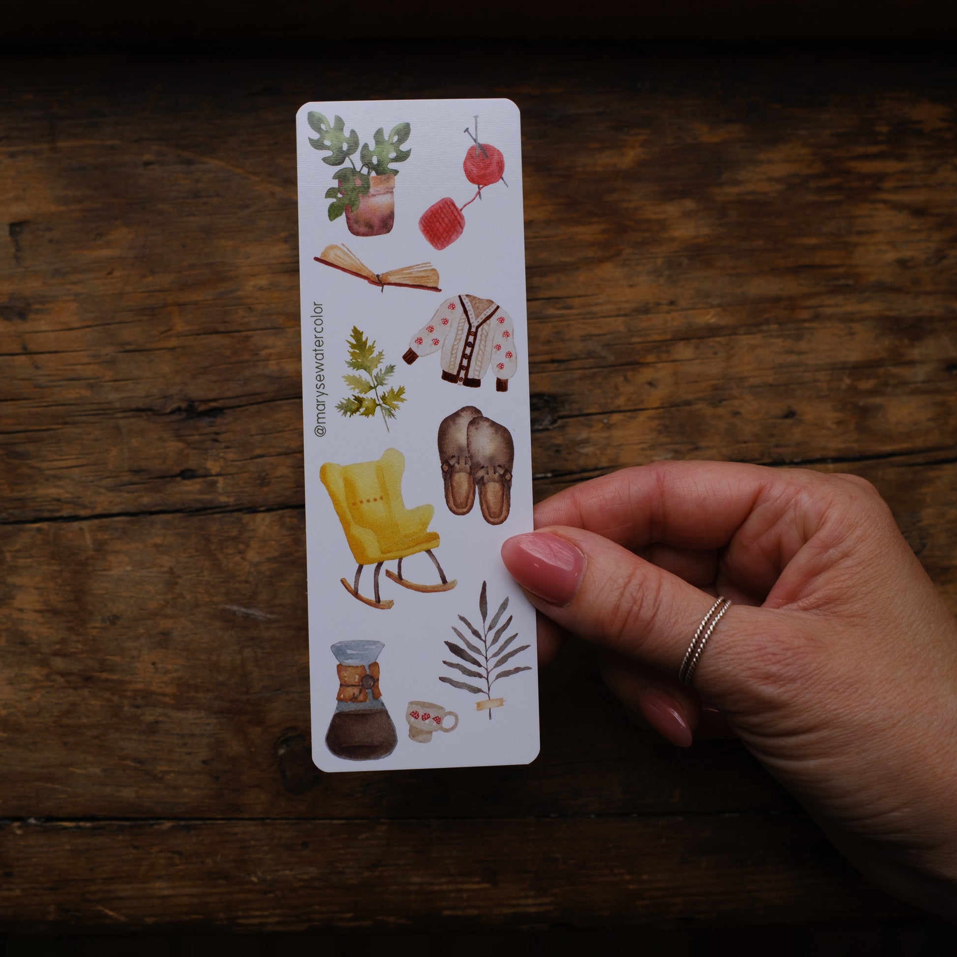 Marque-page illustrant le confort hygge, imprimé sur un papier cartonné lustré, aux coins arrondis et recto-verso identiques.