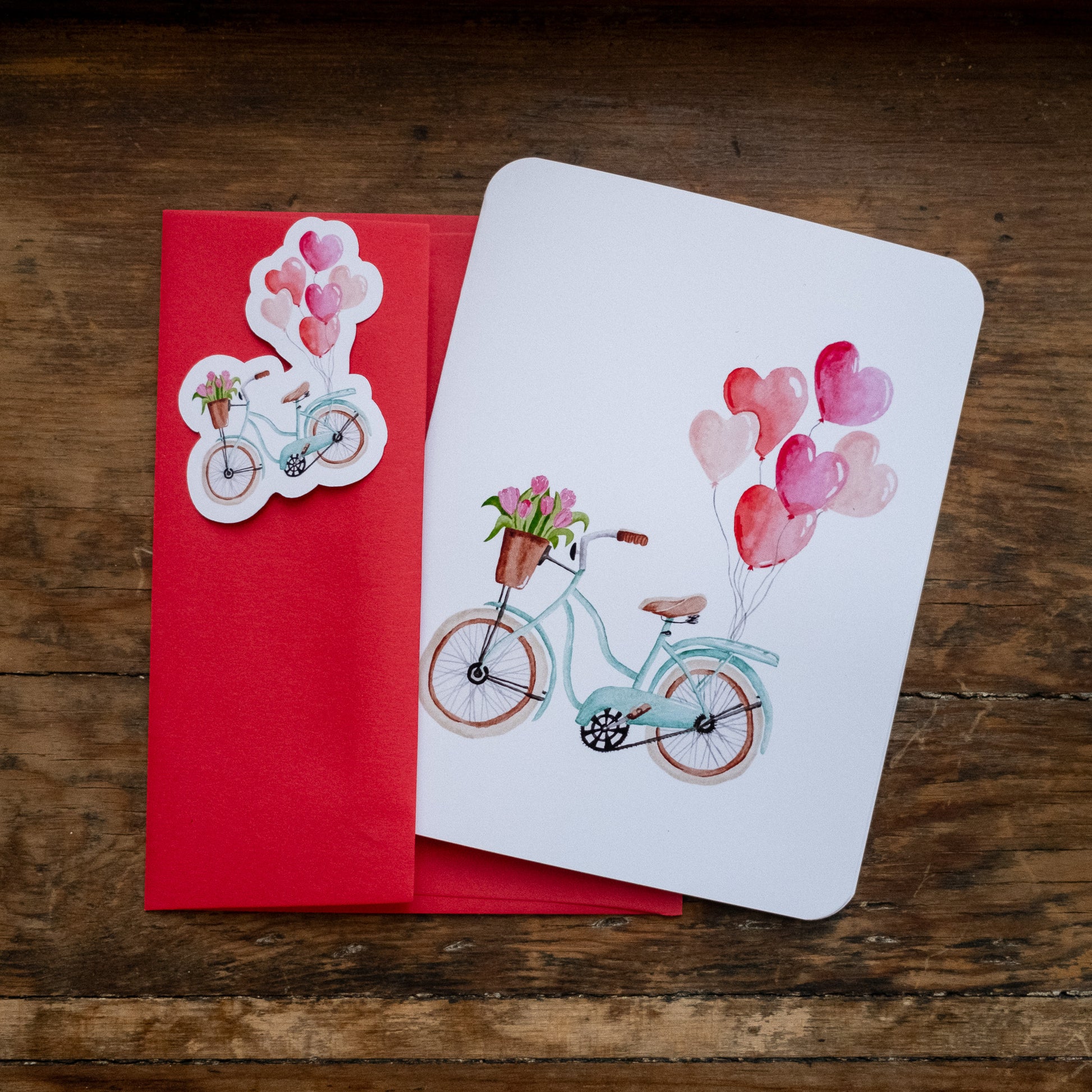Matériaux utilisés : papier mat cartonné haut de gamme, impression numérique, aquarelle, enveloppe rouge, autocollant vinyl mat.